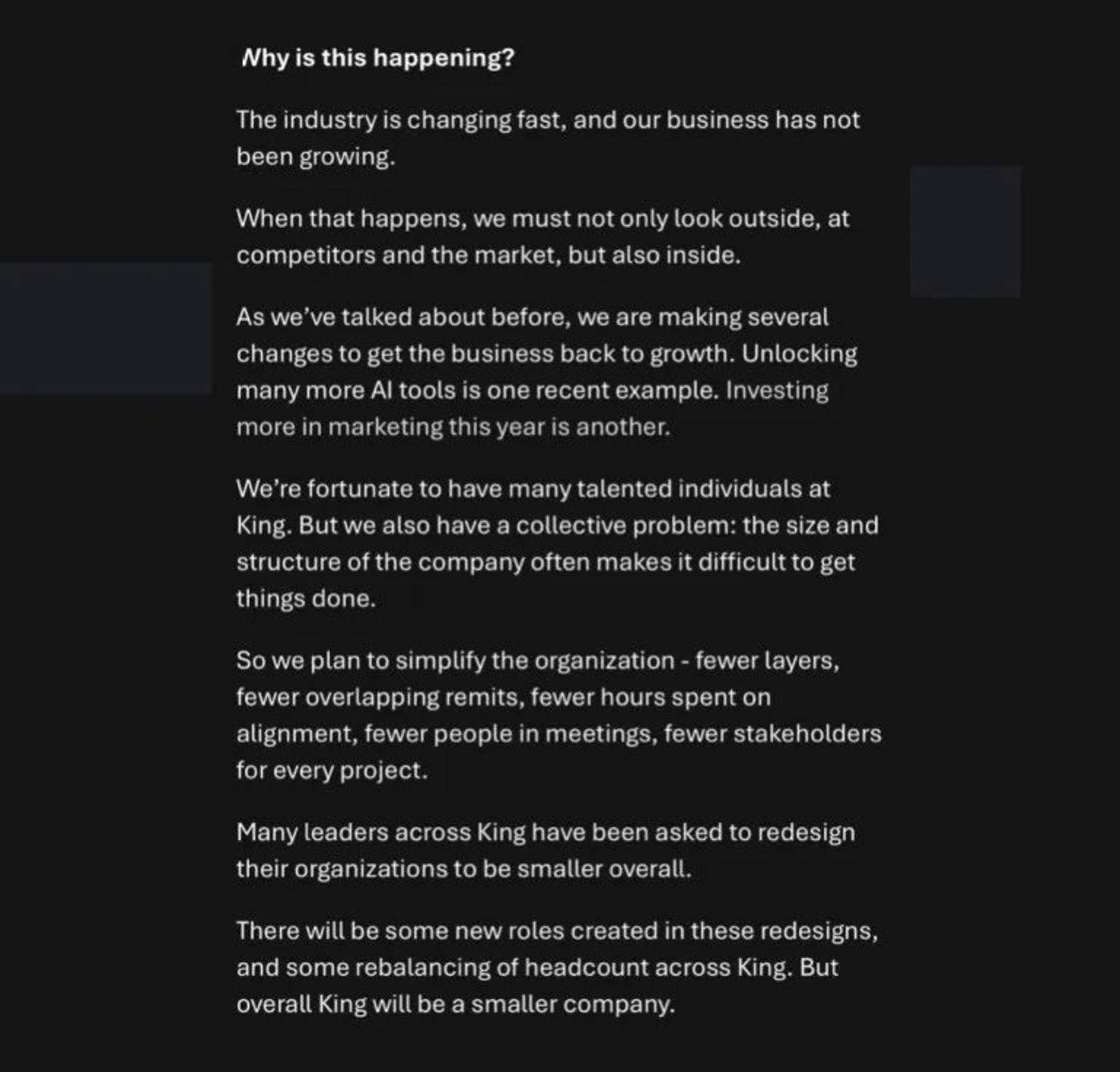 」做为司理,」一位员工说。此次裁人源于「对无法实现的利润方针的预测,King的做法就像是「把所有员工按工资排序,估计9月正式去职。有的人被给了三周时间来签订文件并面子分开,裁人就「持续不竭」。「现正在这些AI东西根基上代替了整个团队。也有人选择继续进行法令诉讼。据悉,」「哪怕是那些正在公司工做了十年以上、为公司成功做出贡献、获得晋升的人,诚恳说很难搞清晰……给出的来由是办理层级繁沉和产物开辟效率低下。